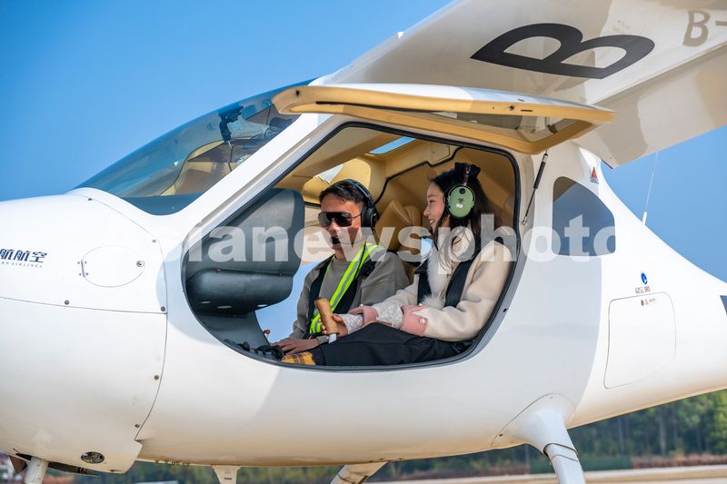 2025年3月8日,在安徽省芜湖市湾沚区花桥镇东方飞谷航空飞行营地,游客乘坐小型固定翼飞机体验飞行乐趣。