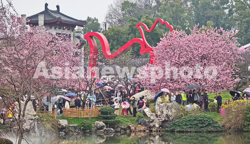 3月9日,湖北武汉东湖樱花园正式开园进入第四天,众多武汉市民和全国外地游客慕名前来,顶风冒雨蹬高远眺共赏早期樱花盛开美景。
