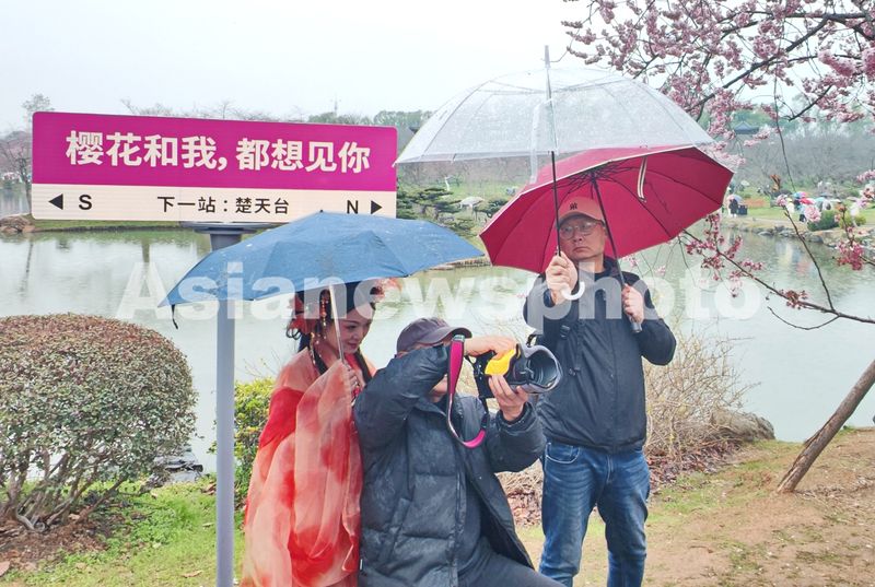 3月9日,湖北武汉东湖樱花园正式开园进入第四天,众多武汉市民和全国外地游客慕名前来,顶风冒雨蹬高远眺共赏早期樱花盛开美景。