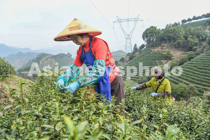 图片说明:2025年3月11日,浙江金华武义县白姆乡更香有机茶基地,村民在“5G智慧茶园”采摘春茶。