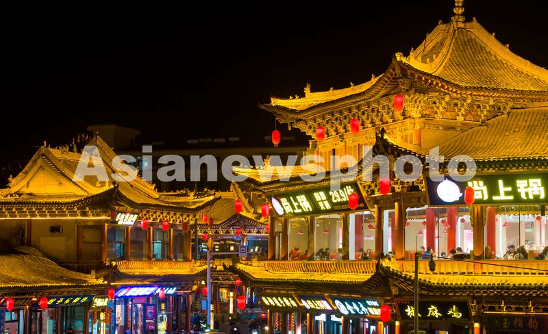 2025年3月10日,甘肃省张掖市甘州区明清老街,游客在灯光璀璨的老街品尝特色美食。