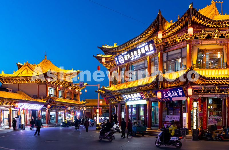 2025年3月10日,甘肃省张掖市甘州区明清老街,游客在灯光璀璨的老街品尝特色美食、购买特色文创产品。