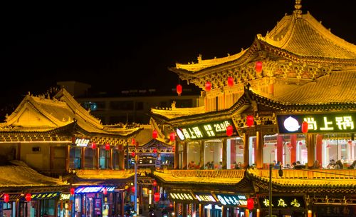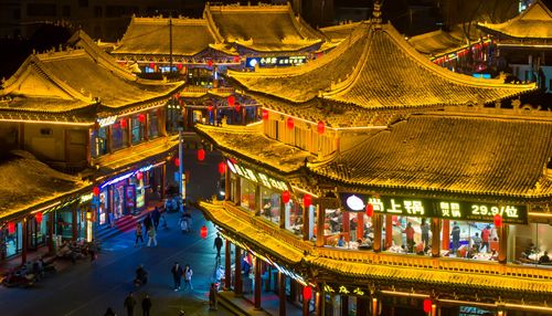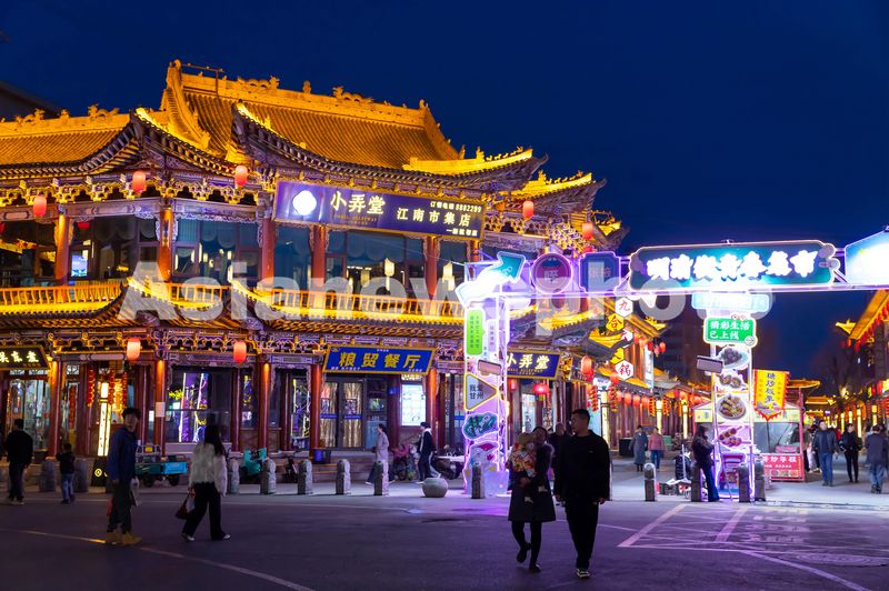 2025年3月10日,甘肃省张掖市甘州区明清老街,游客在灯光璀璨的老街品尝特色美食、购买特色文创产品。