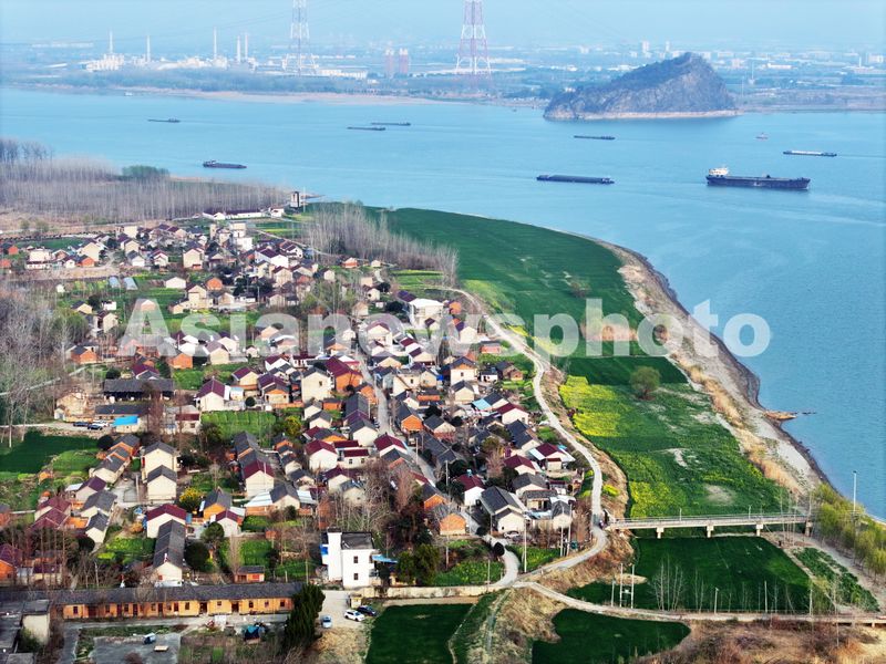 3月8日,安徽省马鞍山市郑蒲港新区白桥镇西梁山村,田园披绿,错落有致的民居与长江、行船、西梁山、东梁山相映成趣,美不胜收,构成一幅春日美丽画卷。