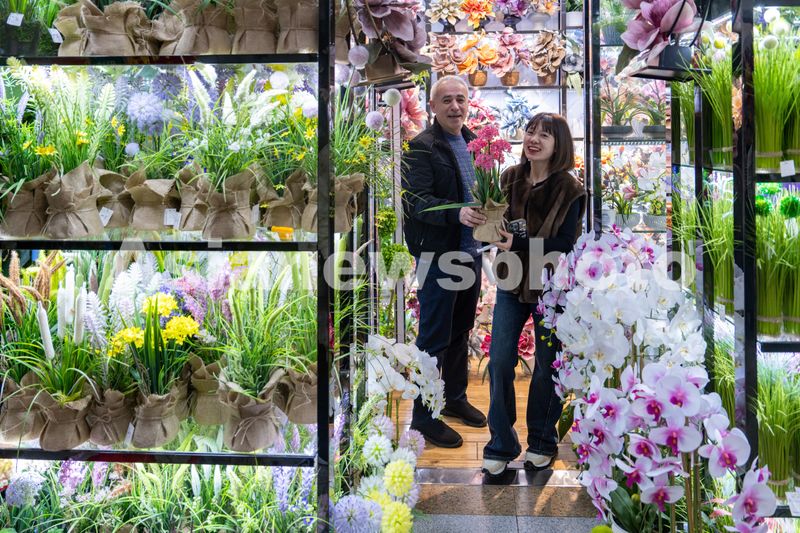 2025年3月12日,在浙江省金华市义乌国际商贸城的仿真花区域,前来选购的外商络绎不绝,显示出强劲的外贸需求。