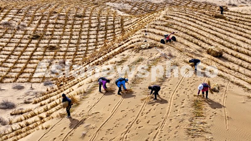 2025年3月13日,甘肃省张掖市高台县黑泉镇西沙窝“三北”工程防沙治沙项目现场,“绿色使者”们正在沙坡上俯身铺稻草。