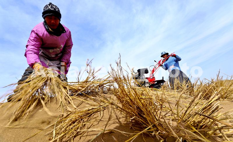 2025年3月13日,甘肃省张掖市高台县黑泉镇西沙窝“三北”工程防沙治沙项目现场,“绿色使者”们正在沙丘上俯身铺草,“新式装备”压草机正在营建稻草草方格。