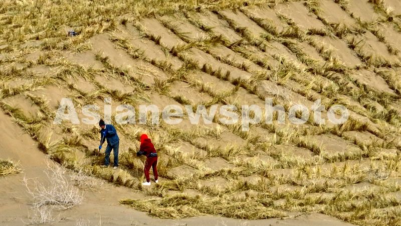 2025年3月13日,甘肃省张掖市高台县黑泉镇西沙窝“三北”工程防沙治沙项目现场,“绿色使者”们正在沙坡上俯身铺稻草。