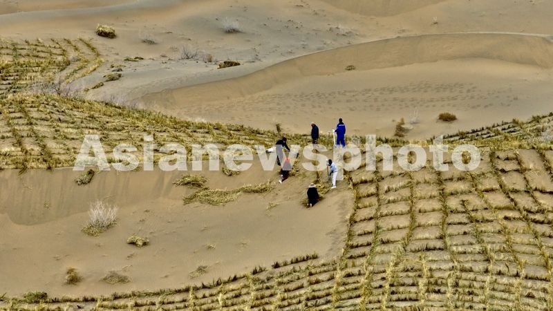 2025年3月13日,甘肃省张掖市高台县黑泉镇西沙窝“三北”工程防沙治沙项目现场,“绿色使者”们正在沙坡上俯身铺稻草。