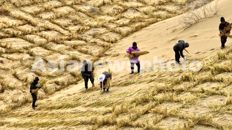 2025年3月13日,甘肃省张掖市高台县黑泉镇西沙窝“三北”工程防沙治沙项目现场,“绿色使者”们正在沙坡上俯身铺稻草。