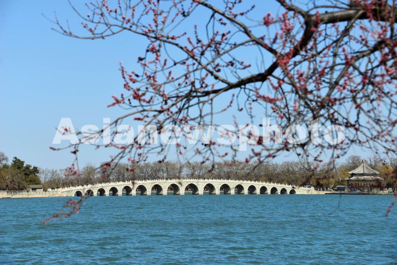 2025年3月12日,北京颐和园春和景明,西堤的山桃花盛开,吸引众多游客前来踏青赏花。