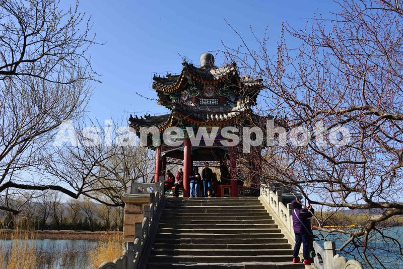 2025年3月12日,北京颐和园春和景明,西堤的山桃花盛开,吸引众多游客前来踏青赏花。