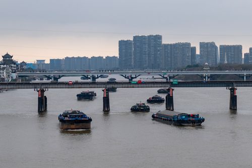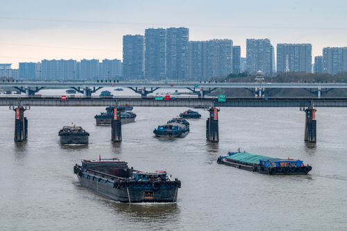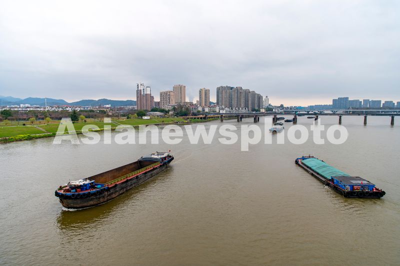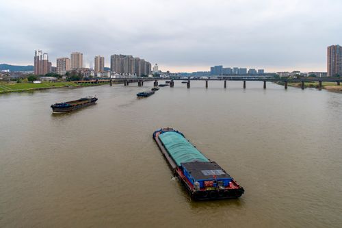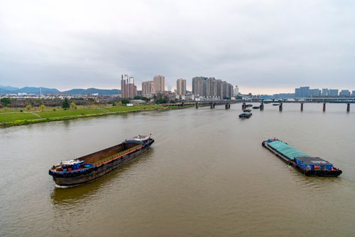 2025年3月13日,浙江金华兰溪境内的钱塘江中上游兰江航道上,装载各类货物的船舶往来穿梭,有序航行,呈现一派繁忙运输景象。