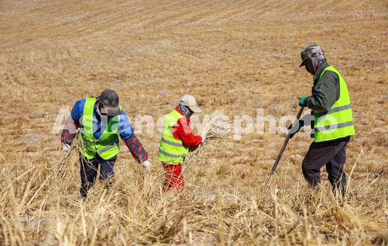 图片说明:2025年3月16日,在巴丹吉林沙漠西缘的甘肃省酒泉市肃州区清水盐池沙窝,工人们正在用稻草压沙,在沙丘上铺开一道道整齐的稻草网格。
