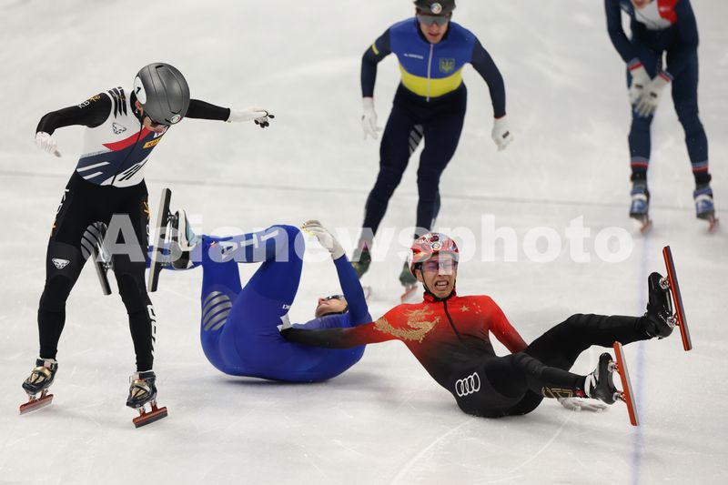 图片说明:中国选手孙龙(右)在比赛中与对手同时摔倒。