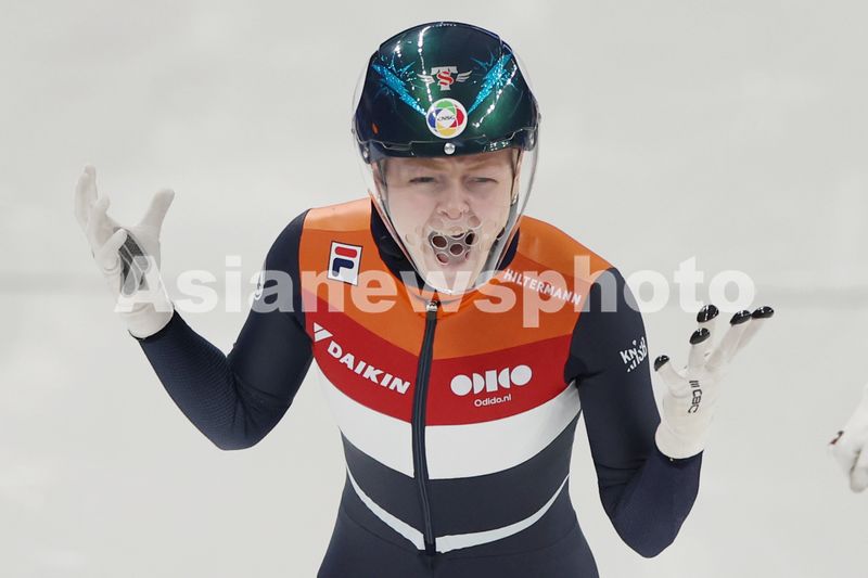 图片说明:荷兰选手桑德拉在比赛中庆祝胜利。
