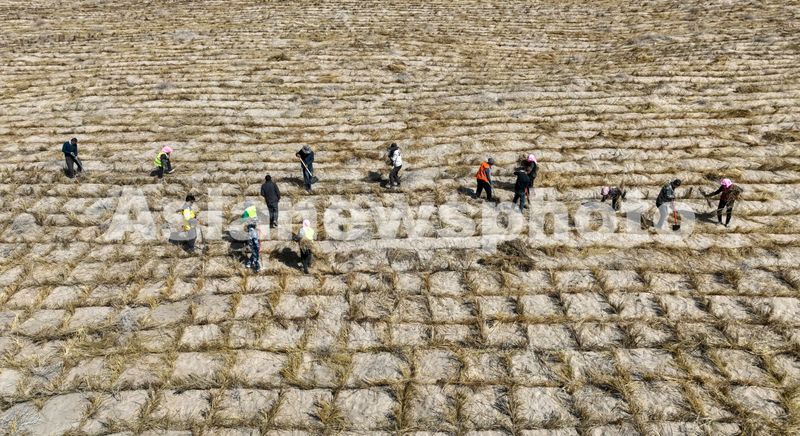 图片说明:2025年3月16日,在巴丹吉林沙漠西缘的甘肃省酒泉市肃州区清水盐池沙窝,工人们正在用稻草压沙,在沙丘上铺开一道道整齐的稻草网格。