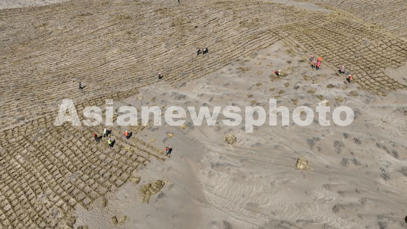 图片说明:2025年3月16日,在巴丹吉林沙漠西缘的甘肃省酒泉市肃州区清水盐池沙窝,工人们正在用稻草压沙,在沙丘上铺开一道道整齐的稻草网格。