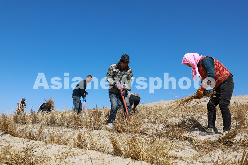 图片说明:2025年3月16日,在巴丹吉林沙漠西缘的甘肃省酒泉市肃州区清水盐池沙窝,工人们正在用稻草压沙,在沙丘上铺开一道道整齐的稻草网格。