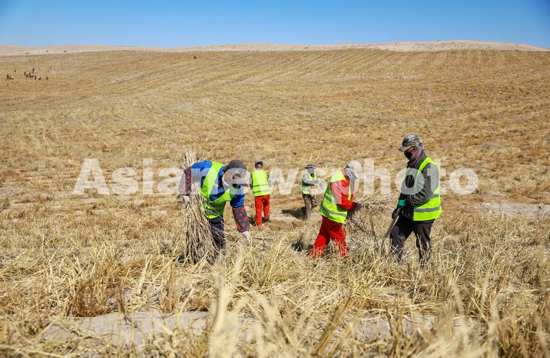 图片说明:2025年3月16日,在巴丹吉林沙漠西缘的甘肃省酒泉市肃州区清水盐池沙窝,工人们正在用稻草压沙,在沙丘上铺开一道道整齐的稻草网格。