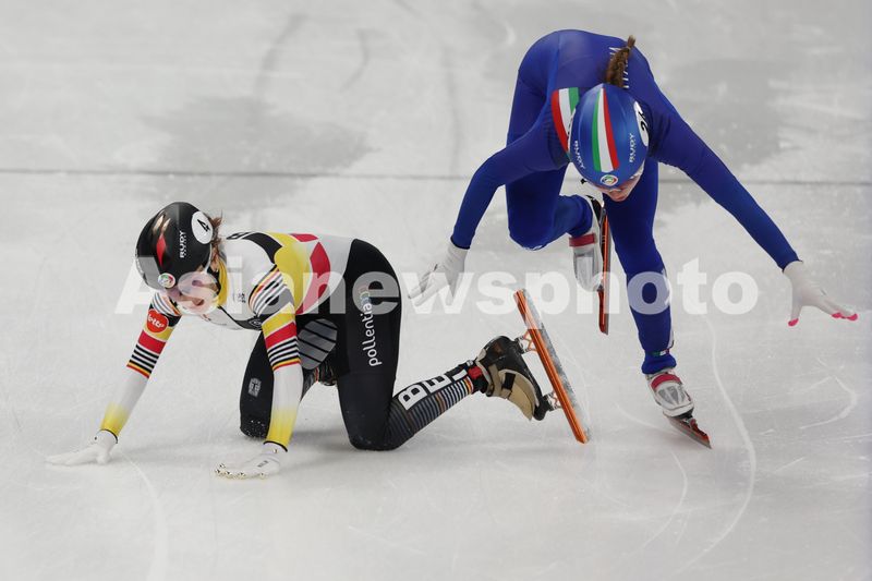图片说明:比利时选手汉娜·德梅(左)在比赛中摔倒。