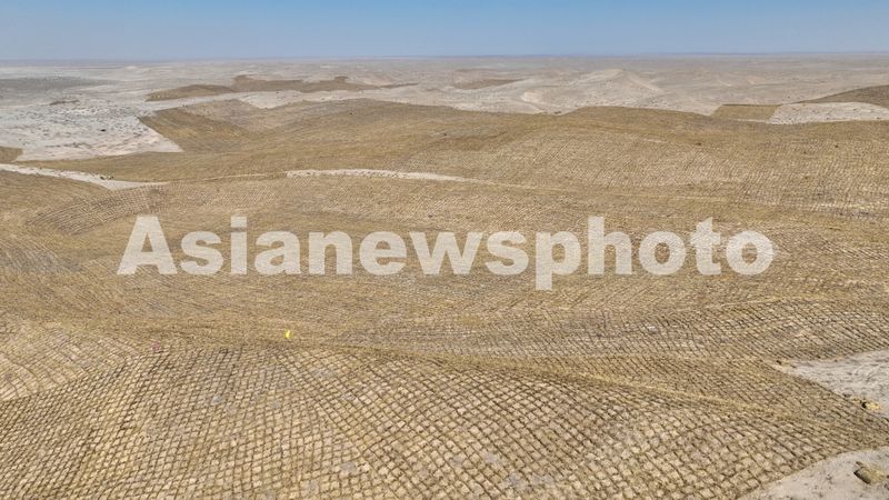 图片说明:2025年3月16日,在巴丹吉林沙漠西缘的甘肃省酒泉市肃州区清水盐池沙窝,工人们正在用稻草压沙,在沙丘上铺开一道道整齐的稻草网格。