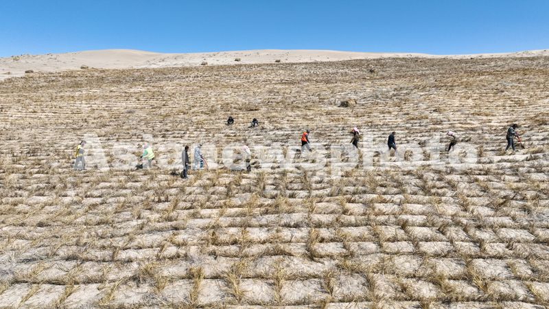 图片说明:2025年3月16日,在巴丹吉林沙漠西缘的甘肃省酒泉市肃州区清水盐池沙窝,工人们正在用稻草压沙,在沙丘上铺开一道道整齐的稻草网格。