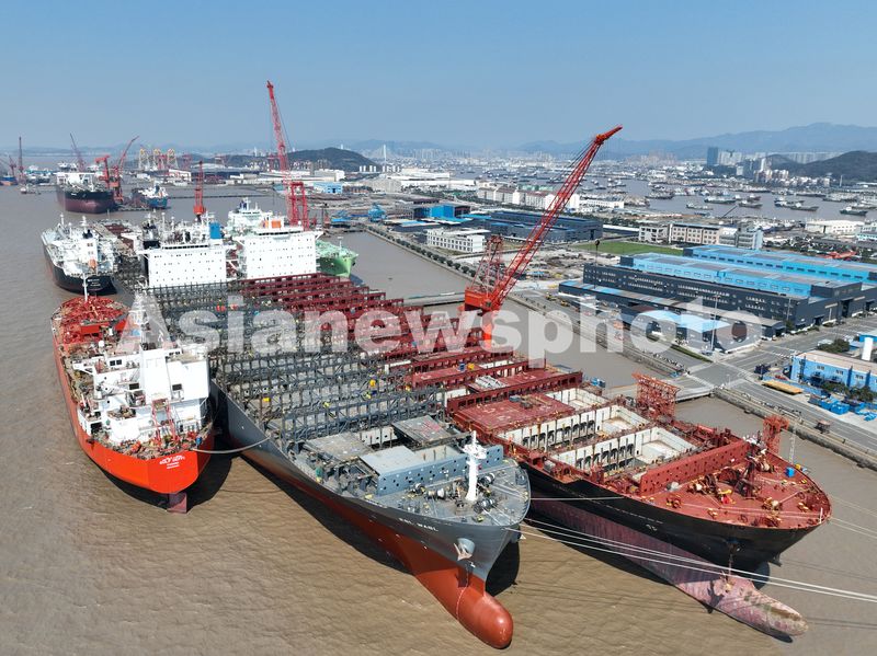 2025年3月18日,浙江省舟山市普陀区小干岛上的船舶维修企业码头和船坞内一派繁忙景象,工人们正在抓紧维修船舶。