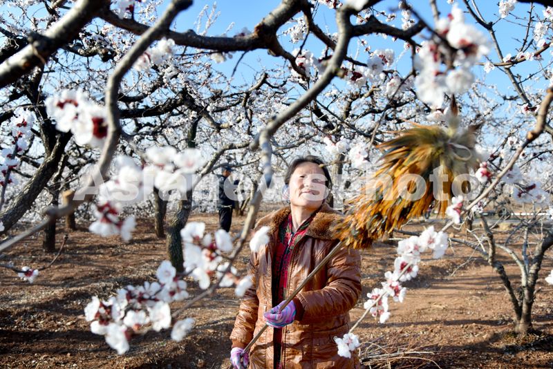 2025年3月18日,山东省枣庄市山亭区水泉镇西堌城村农民为杏花人工授粉。