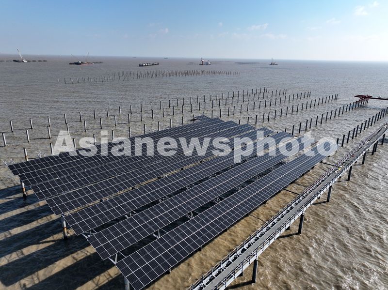 图片说明:2025年3月18日,中核田湾滩涂光伏示范项目施工现场,建设者正在进行海上施工作业。