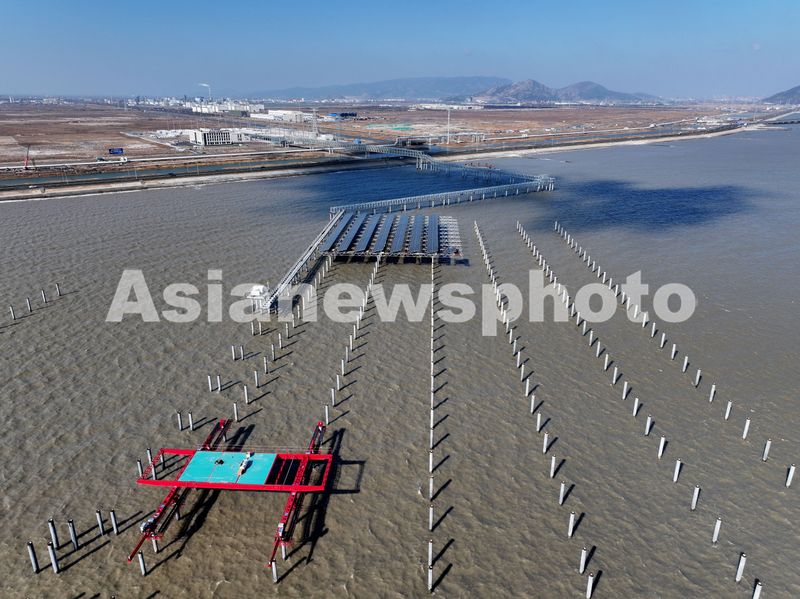 图片说明:2025年3月18日,中核田湾滩涂光伏示范项目施工现场,建设者正在进行海上施工作业。