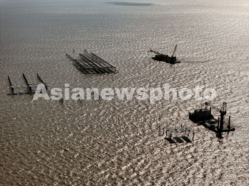 图片说明:2025年3月18日,中核田湾滩涂光伏示范项目施工现场,建设者正在进行海上施工作业。