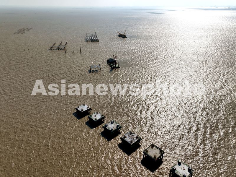图片说明:2025年3月18日,中核田湾滩涂光伏示范项目施工现场,建设者正在进行海上施工作业。