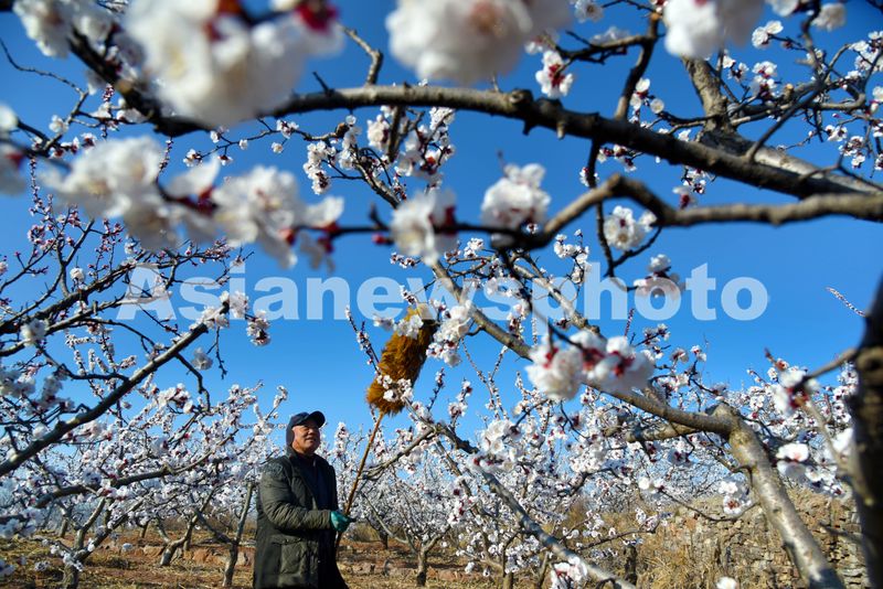 山东枣庄:杏花人工授粉