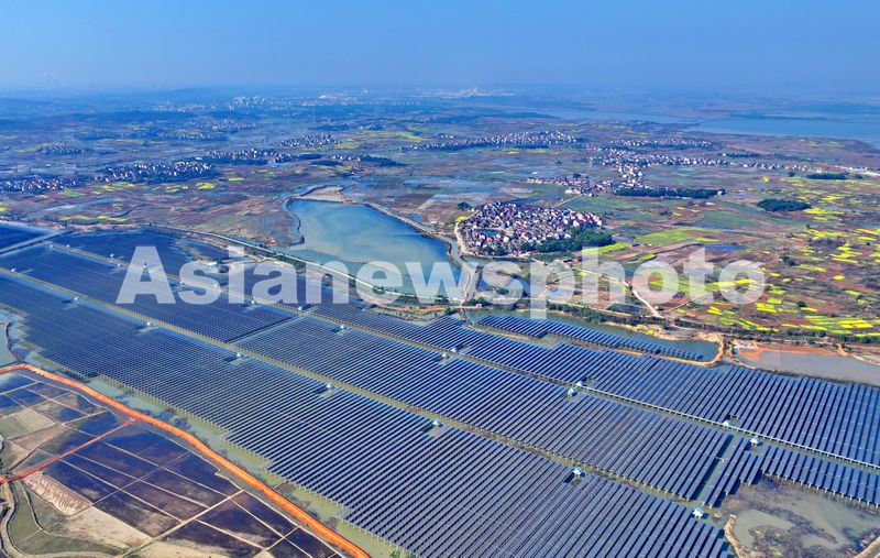 图片说明:2025年3月17日,江西省宜春市丰城市同田乡浠湖村的200兆瓦渔光互补光伏发电站,养殖鱼塘塘面安装的光伏发电板熠熠生辉,并源源不断地转化成电能输往电网。