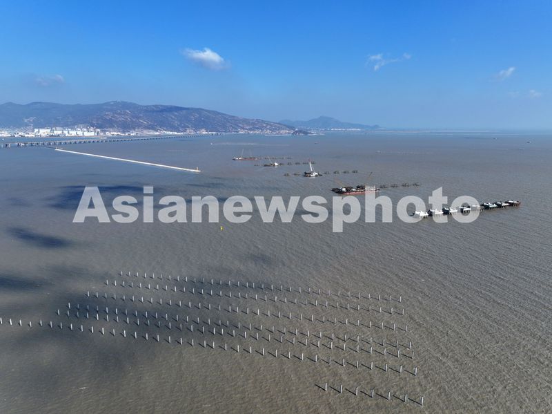 图片说明:2025年3月18日,中核田湾滩涂光伏示范项目施工现场,建设者正在进行海上施工作业。