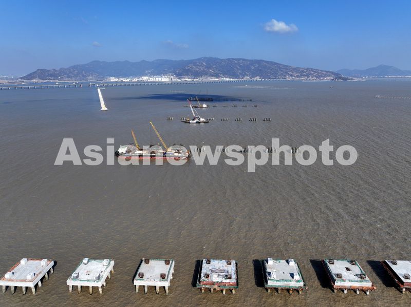 图片说明:2025年3月18日,中核田湾滩涂光伏示范项目施工现场,建设者正在进行海上施工作业。