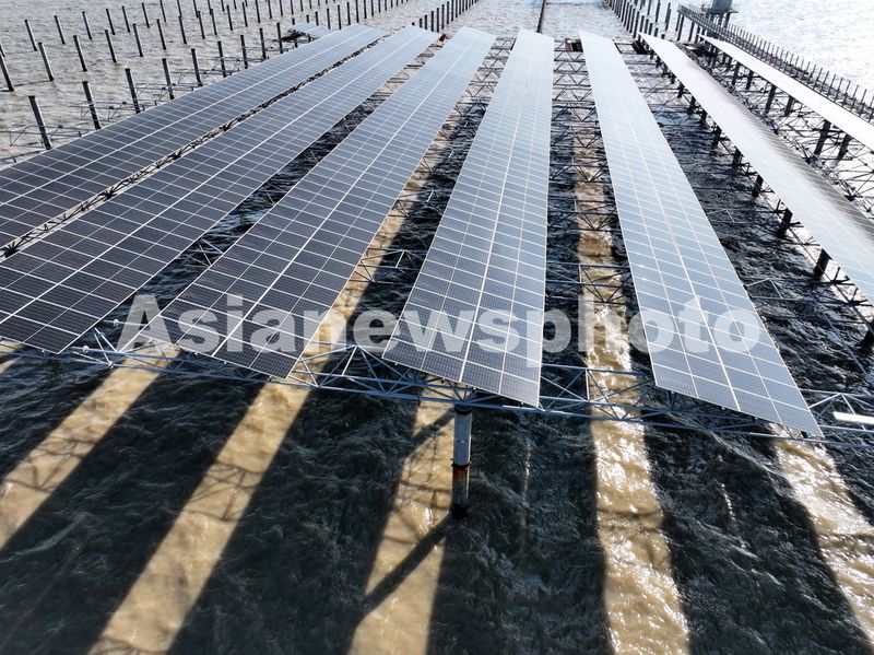 图片说明:2025年3月18日,中核田湾滩涂光伏示范项目施工现场,建设者正在进行海上施工作业。