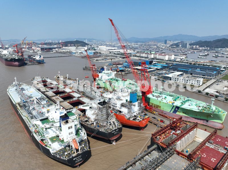 2025年3月18日,浙江省舟山市普陀区小干岛上的船舶维修企业码头和船坞内一派繁忙景象,工人们正在抓紧维修船舶。