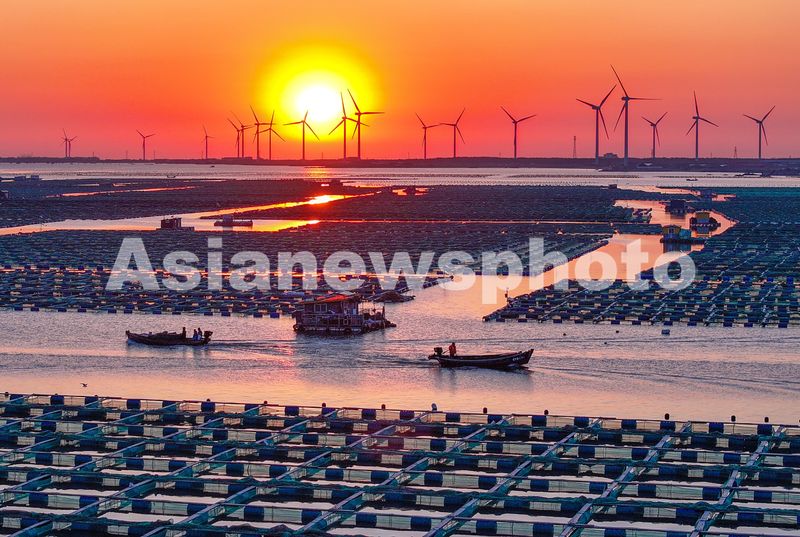 2025年3月19日,山东省荣成市桑沟湾海洋牧场,转动工作的风力发电机与朝霞、大海、渔船交相辉映,景美如画。近年来,荣成市积极融入绿色低碳高质量发展先行区建设,依托沿海丰富的风能、光能资源,科学规划布局海上风电建设,建成的大批新型风力发电、光伏发电等绿色能源,推进碳达峰、碳中和,有力促进了当地渔业经济发展,助力乡村振兴。