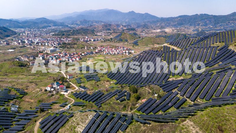 2025年3月18日,俯瞰浙江省金华市金东区源东乡农光互补光伏发电项目现场,光伏发电板覆盖在山坡上(无人机照片)。