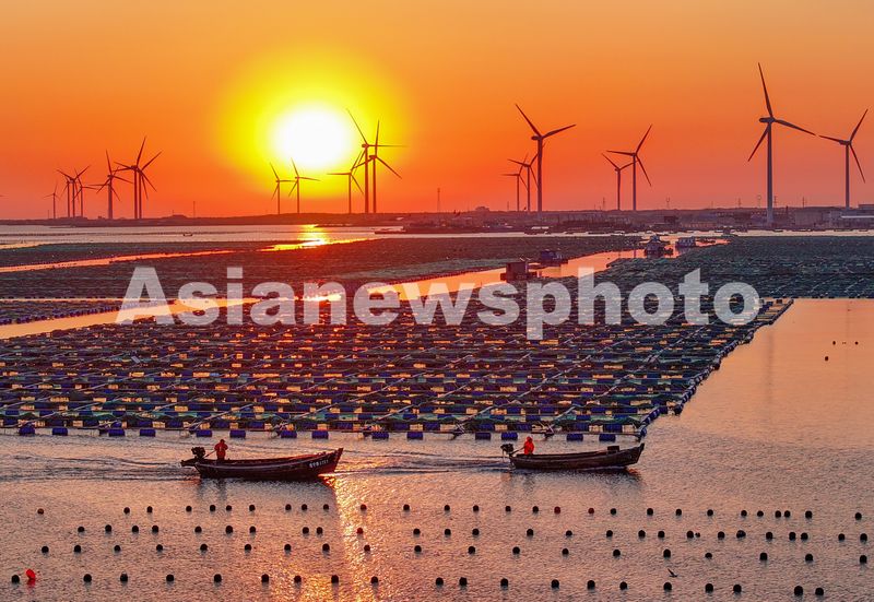 2025年3月19日,山东省荣成市桑沟湾海洋牧场,转动工作的风力发电机与朝霞、大海、渔船交相辉映,景美如画。近年来,荣成市积极融入绿色低碳高质量发展先行区建设,依托沿海丰富的风能、光能资源,科学规划布局海上风电建设,建成的大批新型风力发电、光伏发电等绿色能源,推进碳达峰、碳中和,有力促进了当地渔业经济发展,助力乡村振兴。