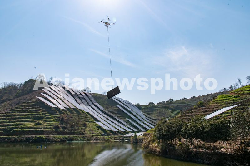 2025年3月18日,浙江省金华市金东区源东乡农光互补光伏发电项目现场,无人机在搬运光伏发电板,进行安装作业。