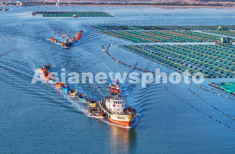 2025年3月19日,山东省荣成市桑沟湾海洋牧场生态养殖区,渔民驾驶渔船出海作业。