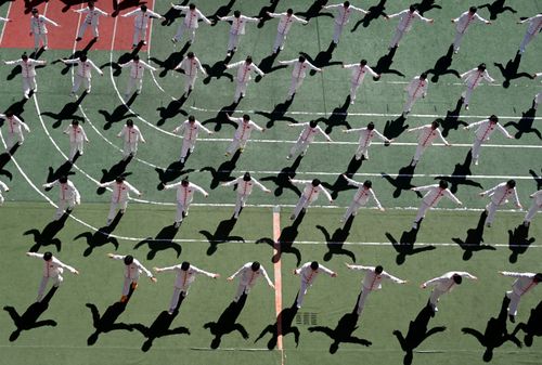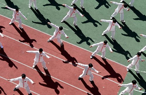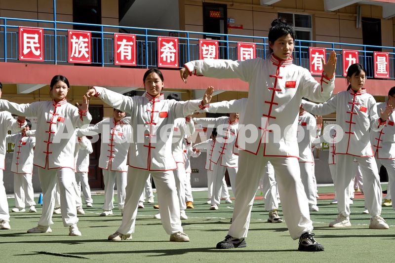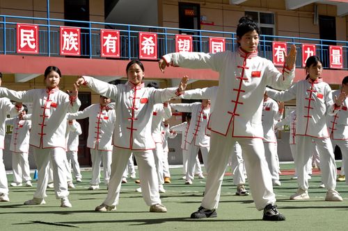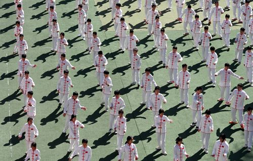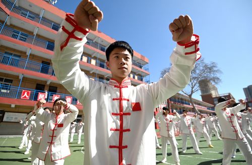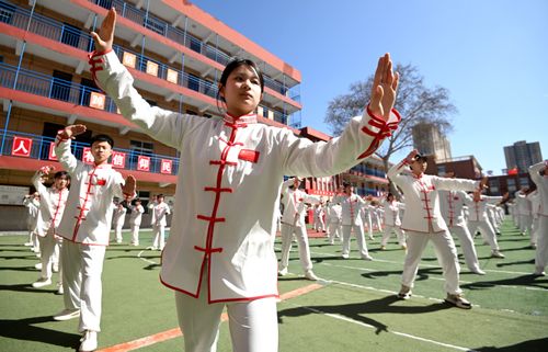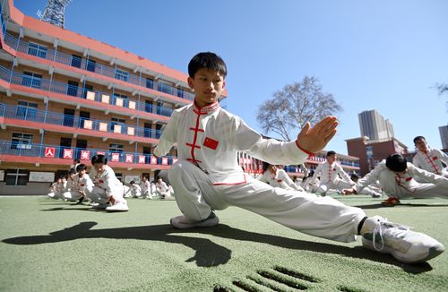图片说明:3月20日,河北省邯郸市邯山区实验中学的学生在练习太极拳。