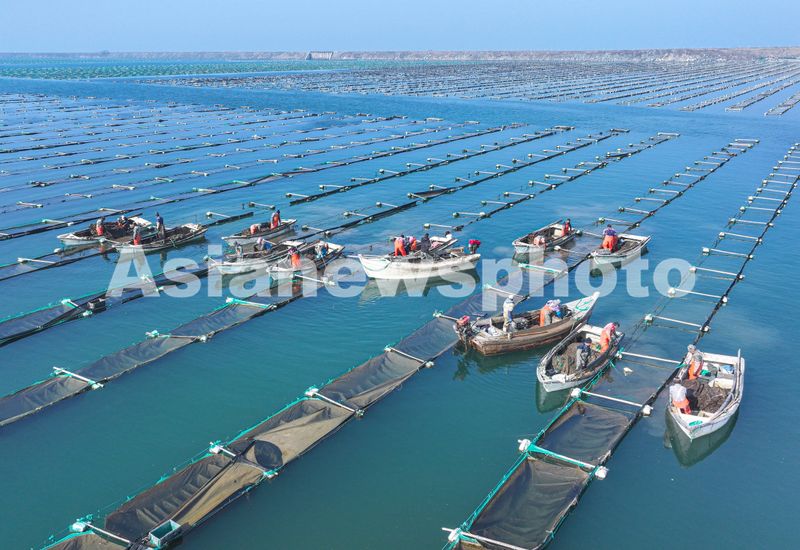图片说明:2025年3月20日,山东省荣成市天海湾海洋牧场海参养殖区,渔民们在进行海参苗管护作业。
