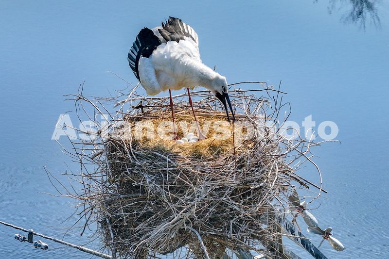 2025年3月19日,在江苏省扬州市宝应县曹甸镇的一处铁塔顶端,东方白鹳在鸟巢中繁育后代。近年来,随着当地生态环境持续向好,这种国家一级保护动物已连续多年在此筑巢繁衍,预计本月将迎来集中孵化期。