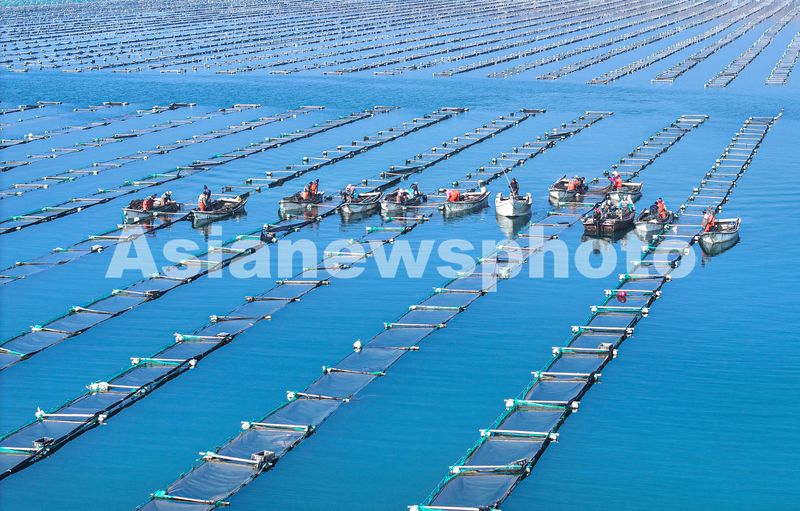 图片说明:2025年3月20日,山东省荣成市天海湾海洋牧场海参养殖区,渔民们在进行海参苗管护作业。