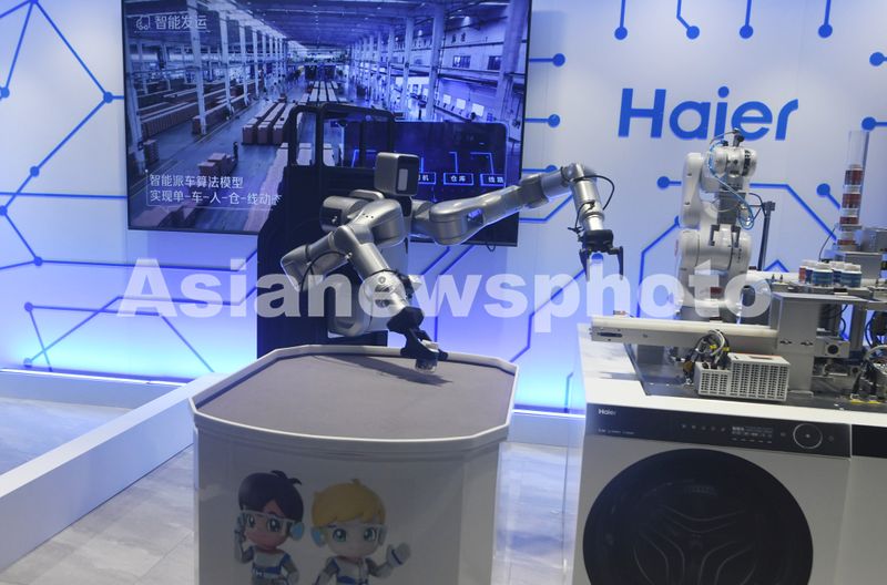 图片说明:2025年3月20日,在2025中国家电及消费电子博览会(2025AWE)上海尔展台展示的具身智能机器人在家电生产线上应用。