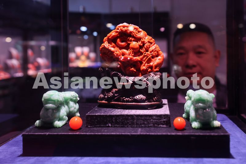 图片说明:2025年3月19日,观众在 2025北京国际珠宝展上观看展出的南红摆件。